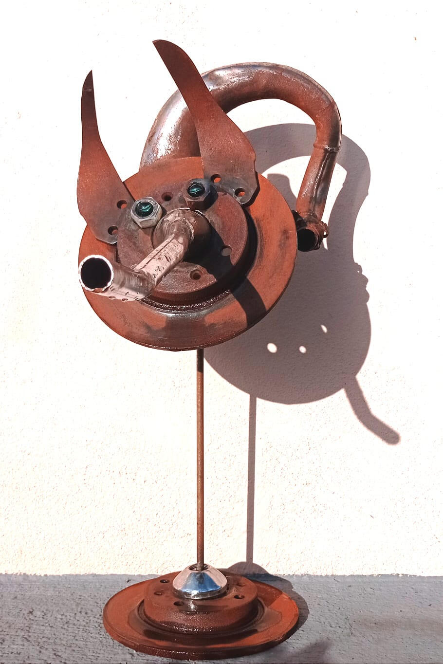 Mis esculturas son figurativas, creadas a partir de desechos, principalmente metálicos, aunque también uso elementos de plástico, vidrio o madera, manteniendo el toque de óxido que han conseguido de manera natural, que da una lectura del embellecimiento de la pieza y cuánto tiempo puede llevar abandonada a la intemperie.